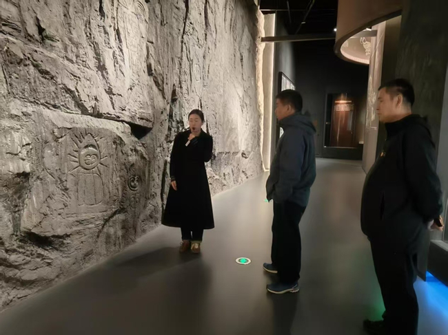 在博物院展廳內,黨員們循著“黃河從草原上流過——鄂爾多斯歷史文化陳列”的脈絡沉浸式參觀。從“河套人頭蓋骨”見證的遠古文明,到“朱開溝中華第一銅劍”承載的早期冶金技術,從“鄂爾多斯青銅器”展現(xiàn)的草原絲路風采,到VR技術復原的秦直道盛景,文物與科技的融合讓大家直觀感受了黃河文化、草原文化與農耕文化在鄂爾多斯的碰撞交融 。在“桌子山太陽神巖畫”等文物前,黨員們駐足細品,深入了解鄂爾多斯地區(qū)在多民族交往交流交融中的重要歷史地位,進一步堅定了文化自信。